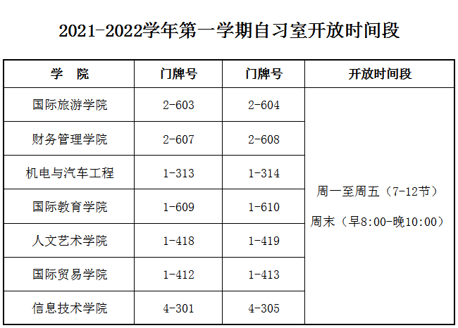 为方便学生在课余时间自主学习,现开放以下教室为自习室,请各学院将安排通知到班级,具体如下: