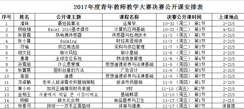 现将我校2017年度青年教师教学大赛决赛公开课时间安排公布如下:
