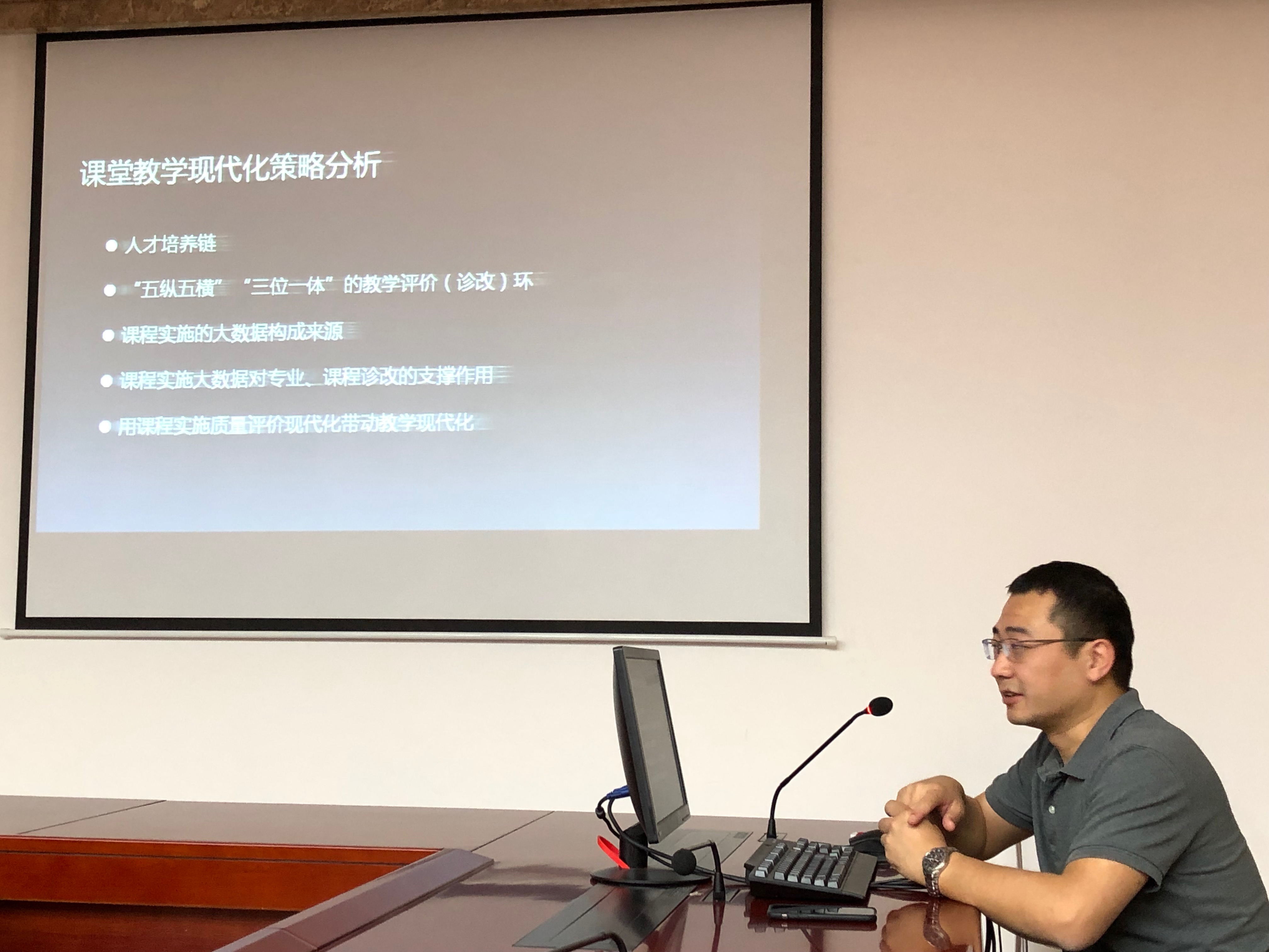 会上,袁总监对“智能云教学时代课程实施质量智能监测平台”做了详细介绍。他从人才培养链、“五纵五横”“三位一体”的教学评价(诊改)环、课程实施的大数据构成及来源、课程实施大数据对专业和课程诊改的支撑作用、等方面详细讲解。他还就学校教学诊改遇到的难点问题和待解决的问题和与会人员进行了交流和探讨。