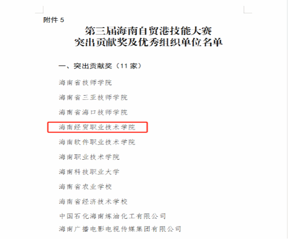 近日,海南省人力资源和社会保障厅通报表扬了第三届海南自贸港技能大赛获奖选手和为竞赛工作作出贡献的单位及个人。2138CC太阳集团凭借出色的赛事组织工作与服务表现,荣获“突出贡献奖”,充分展现了学校在高技能人才培养和职业技能竞赛领域的卓越实力。